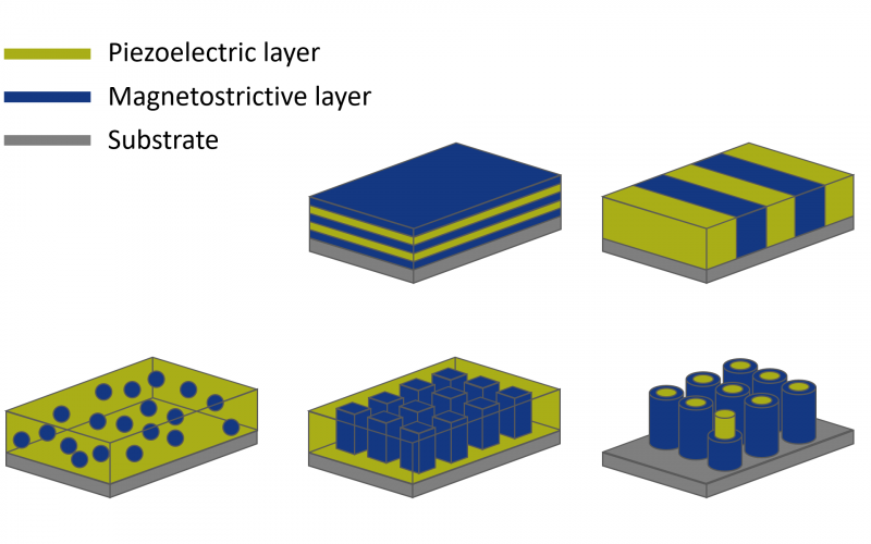 Due to clever combination of materials the magnetoelectric effects can be improved significantly. It is, for example, possible to get a composite material that provides sufficiently strong signals for an electrical signal processing even at room temperature by stacking magnetically active (magnetostrictive) and electrically active (piezoelectric) materials.
